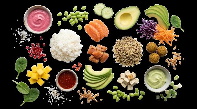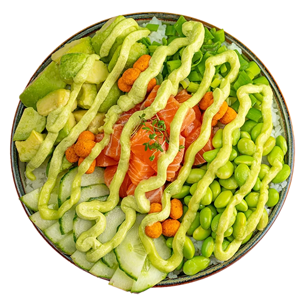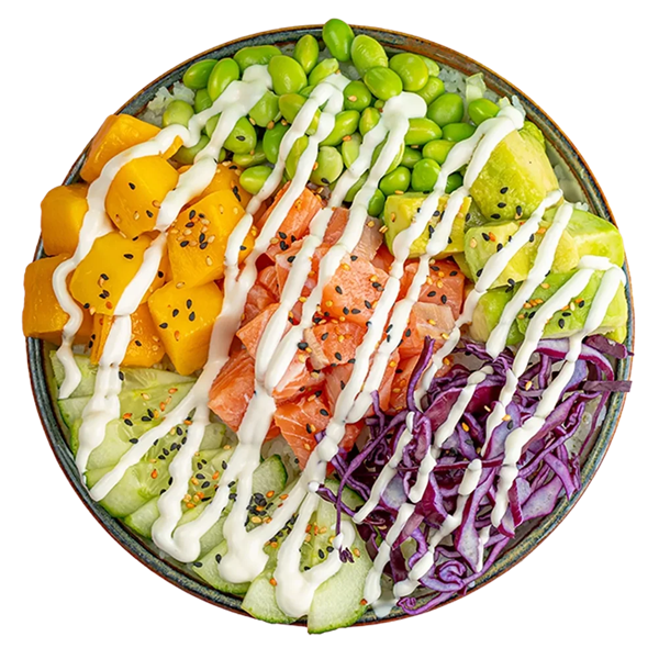 Sushi Reis, Teriyaki Dressing, Lachs, Gurke, Mango, Edamame, Rotkraut, Avocado, Trüffel-Mayo, Sesam seeds