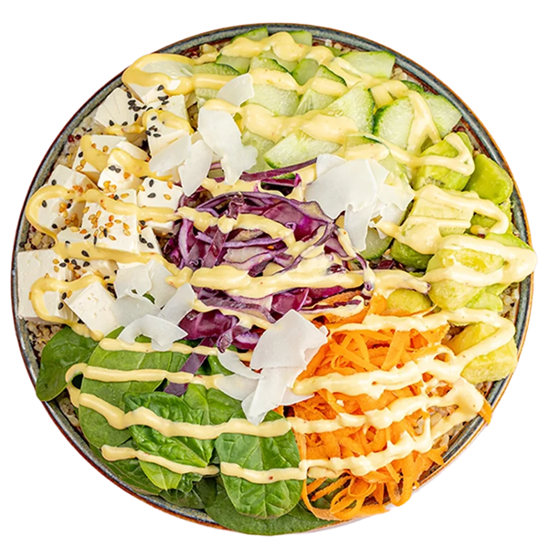 Baby-Blattspinat, Ponzu Dressing, marinierter Tofu, Gurke, geröstete Süßkartoffel, Edamame, Avocado, Vegan Mayo, Cranberry