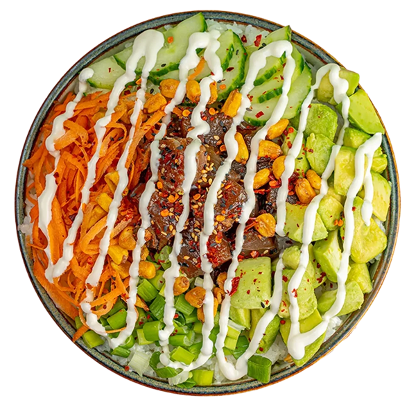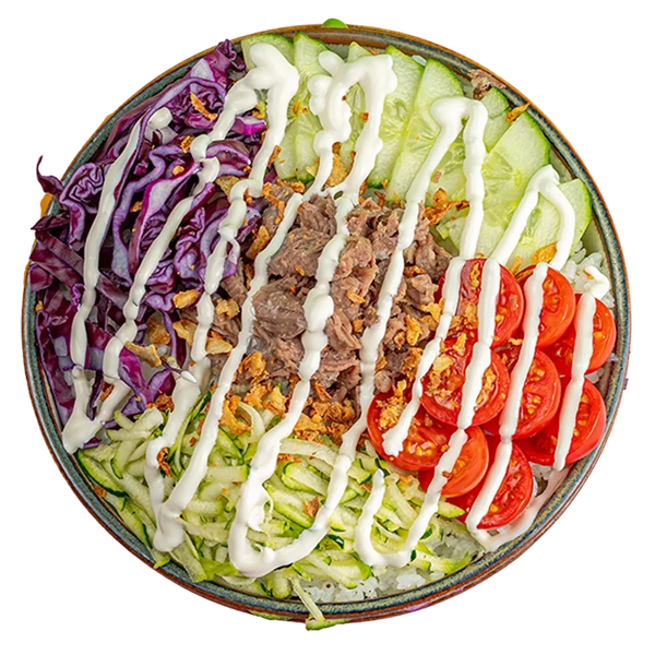 Sushi Reis, Honey-Ginger-Dressing, saftiges Rindfleisch, Rotkraut, Gurke, Zucchini, Tomate, Trüffel-Mayo, Röstzwiebel