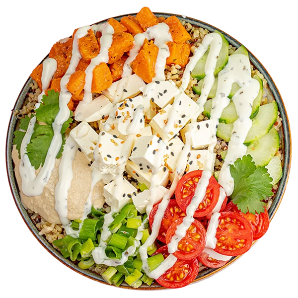 Quinoa-Bulgur Mix, Tahini, Feta, Gurke, Cherrytomaten, Hummus, Frühlingszwiebel, geröstete Süßkartoffel, Limetten-Kräuter-Dressing, Koriander