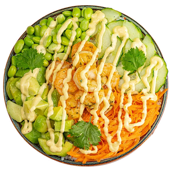 Sushi Reis, Ponzu Dressing, marinierte Shrimps, Avocado, Gurke, Karotte, Edamame, Chili Mango, Koriander