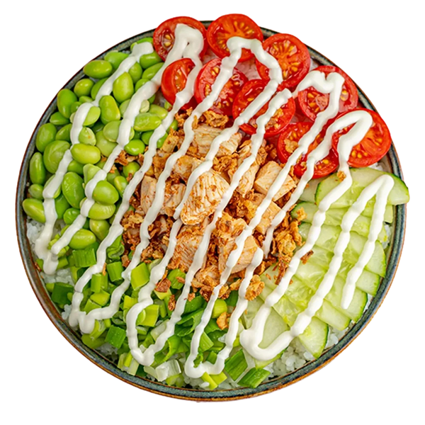 Sushi Reis, Shoyu, zarte Hühnerbrust, Edamame, Gurke, Cherrytomaten, Frühlingszwiebel, Creamy Mayo, Röstzwiebel